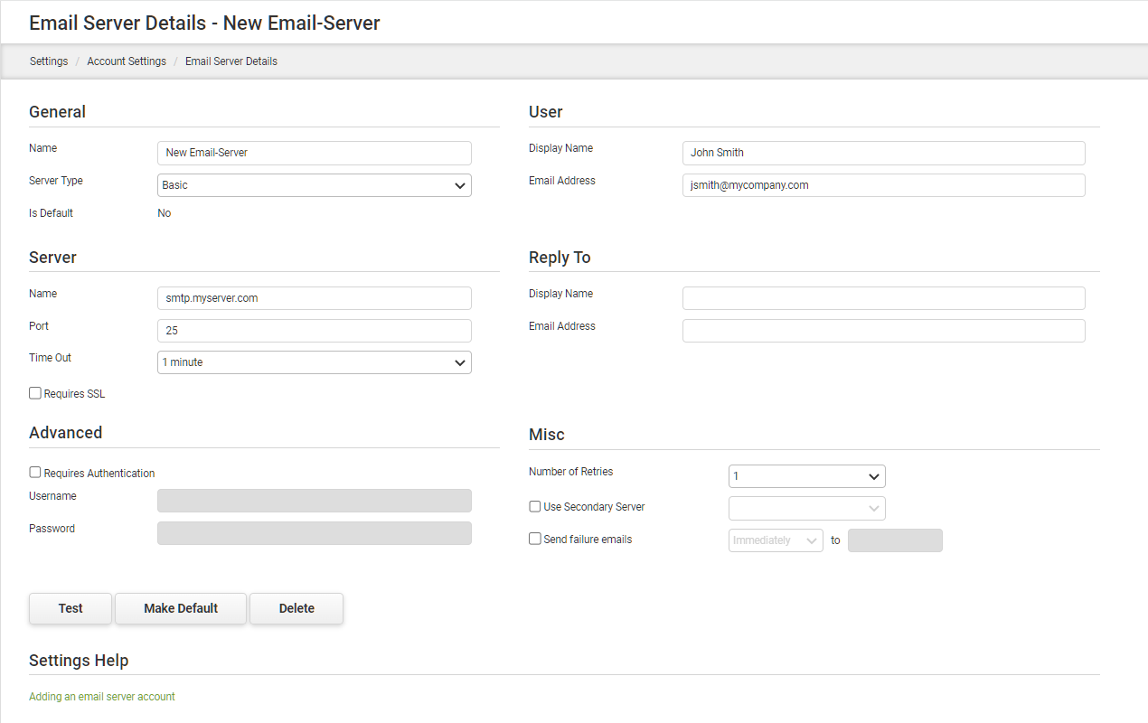 1.Under the Server section, enter the SMTP address in the Name field. The only Type currently supported is SMTP. 2.If the server requires secure authentication, check the Requires SSL box then enter the applicable e-mail username and password below. 3.In the User area, enter the Display Name and Email Address that will be shown to the e-mail recipient on the incoming e-mail. 4.In the Reply to area, enter the Display Name and Email Address that will be shown if the recipient chooses to reply to the e-mail message. 5.Refer to the Failed Notifications section for information regarding the miscellaneous section. 6.Click Apply Changes. 7.After creating the new e-mail server resource, click the Test button to verify the set-up.
