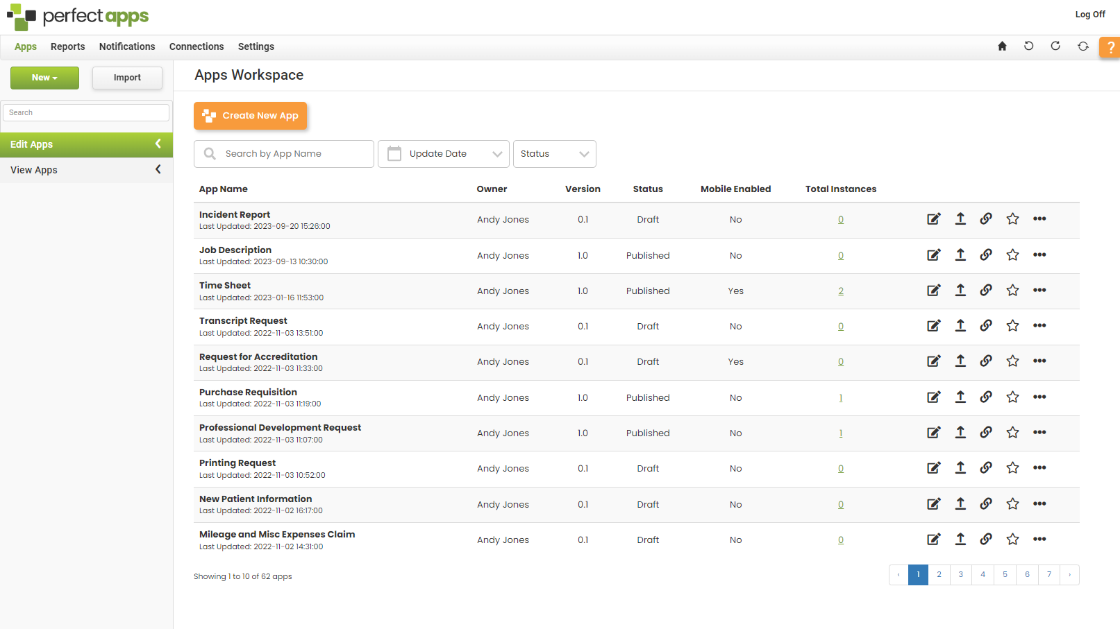 The Apps Workspace allows full users to create apps, import app files (.pa or .pf) and edit existing apps that they own or that have been shared with them.