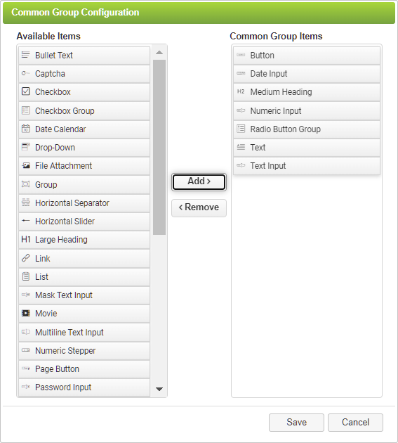 3.Move items from the Available Items list to the Common Group Items list by selecting them and clicking the Add > button.