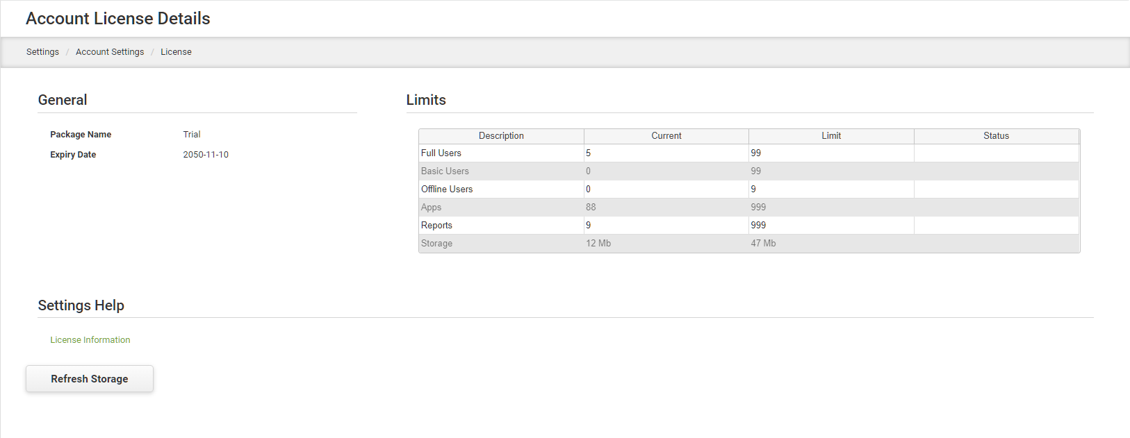 •License Information - Click this link to open this online help guide. •Refresh Storage - Click this button to refresh the page and get up-to-date storage details for the account. |